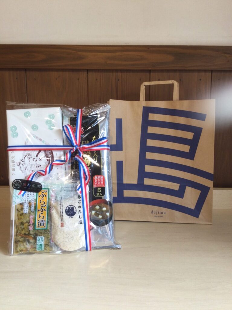 出島限定デザインのパッケージが人気の塩リーフパイや伊勢海老のみそ汁、あごだし塩、